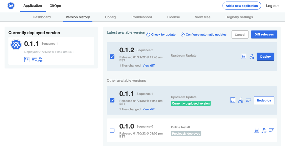 6. (Optional) When there are multiple versions of an application, you can compare the changes between them by clicking Diff releases in the right corner.